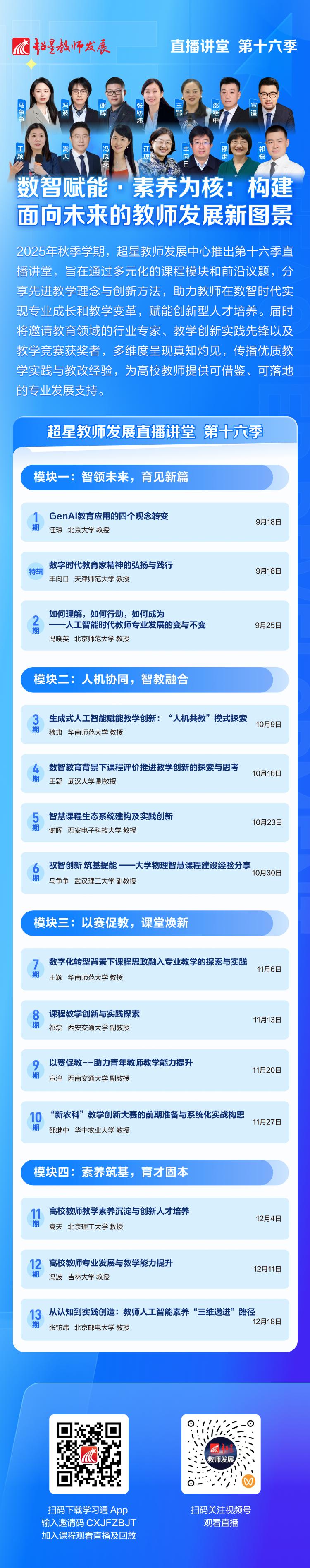 新学期,教师发展中心联合超星集团教师发展服务平台共同推出的“2025年秋教师发展直播讲堂”正式上线啦,超星教师发展中心推出第十六季直播讲堂,旨在通过多元化的课程模块和前沿议题,分享先进教学理念与创新方法,助力教师在数智时代实现专业成长和教学变革,赋能创新型人才培养。届时将邀请教育领域的行业专家、教学创新实践先锋以及教学竞赛获奖者,多维度呈现真知灼见,传播优质教学实践与教改经验,为高校教师提供可借鉴、可落地的专业发展支持。