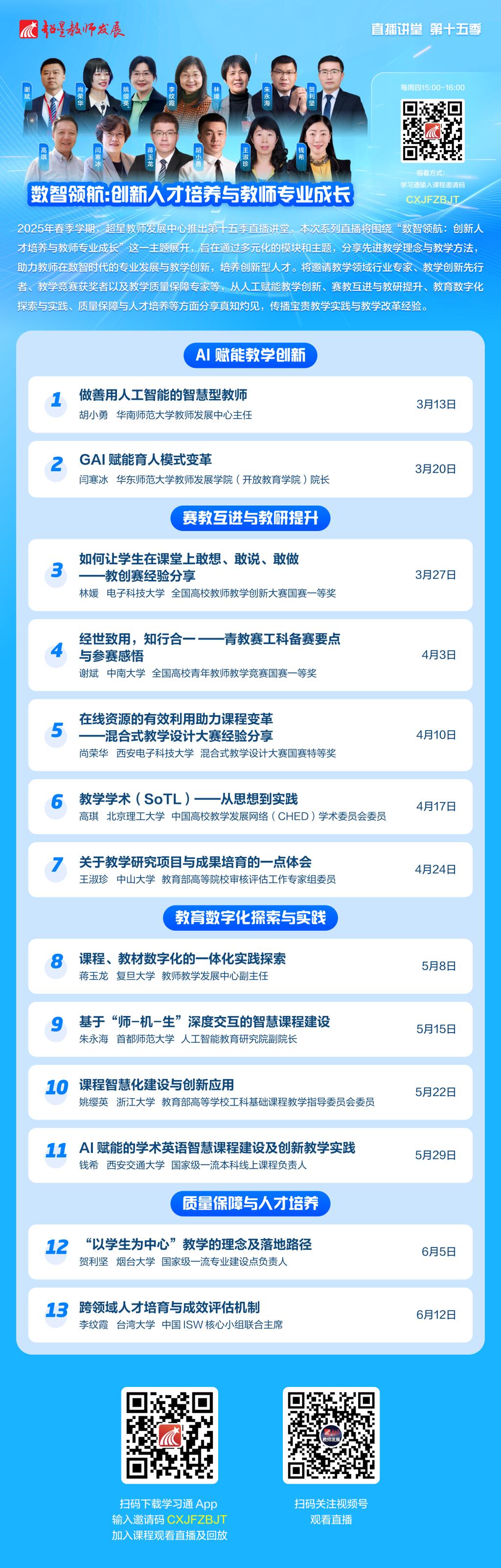 新学期,教师发展中心联合超星集团教师发展服务平台共同推出的“2025年春季学期教师发展直播讲堂”正式上线啦,本次系列直播将围绕“数智领航:创新人才培养与教师专业成长”这一主题展开,旨在通过多元化的模块和主题,分享先进教学理念与教学方法,助力教师在数智时代的专业发展与教学创新,培养创新型人才。将邀请教学领域行业专家、教学创新先行者、教学竞赛获奖者以及教学质量保障专家等,从人工赋能教学创新、赛教互进与教研提升、教育数字化探索与实践、质量保障与人才培养等方面分享真知灼见,传播宝贵教学实践与教学改革经验。