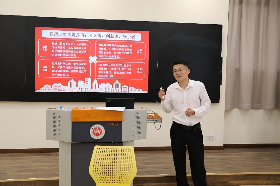 此次培训苗国厚通过系统解读保密政策制度,为新教师厘清工作边界、明确行为准则;并以典型案例为警示,用真实场景让抽象的保密要求变得具体可感,更让 “保密无小事” 的意识深度融入新教师职业认知,有效强化了 “守护国家秘密安全”的责任担当,筑牢了第一道校园保密防线。
